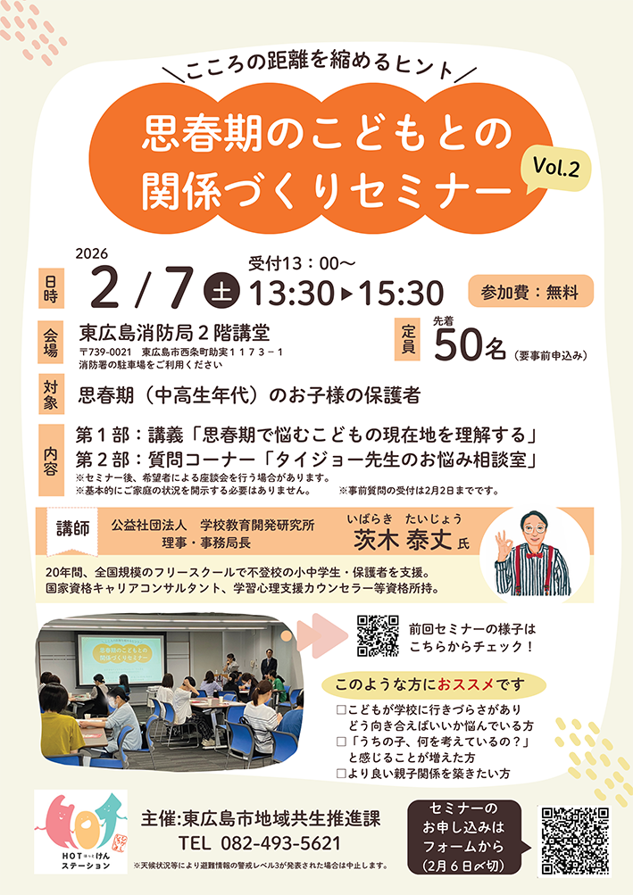 「思春期のこどもとの関係づくりセミナー Vol.2」を開催します