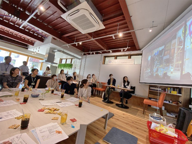 6月は、高屋西地域の「コミュニティスペース楽屋」に出向きました。高屋西地域で学生と地域をつなぐ場づくり等を行っている、まちづくり合同会社G11(ジーイレブン)の菅井様、G11plus(ジーイレブンプラス)楽屋スタッフの松浦様、高屋出張所の村瀬所長にご参加いただき、G11の活動についてお話しいただき、メンバーで理解を深めました。また、楽屋の今後の活用可能性についても検討しました。
