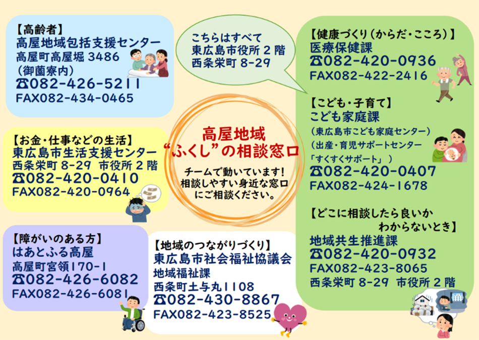 東広島市では、令和4年度から市内10圏域で他職種連携による支援・課題共有の場として、「コアネットワーク会議」を月1回実施しています。高齢者支援、こども子育て支援、障がい者支援などの多機関の専門職がつながるための仕組みで、世代や属性に関わらず、包括的に丸ごと相談を受け止め、チームで支援する体制づくりに取り組んでいます。近年では、コアネットワークが「住民の暮らしの場における、住民と協働する他職種連携チーム」となることを目指して、各圏域で独自の活動が広がっています。今回はその中から、高屋圏域の取組みを紹介します。今年度、高屋圏域では、地域に出向いてコアネットワーク会議を3回実施し、地域の社会資源(人、場所)を知ることに努めました。
