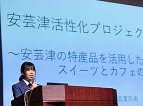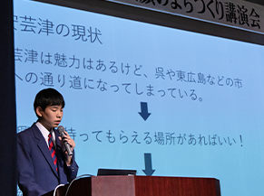 安芸津町を知り、来てもらうきっかけにするためにオリジナルキャラクターを作ってはどうかという案を提言。地域の人と協力して作ることで、世代を超えた交流が生まれて絆が深まり、地域貢献のひとつにもなるという思いも語った。