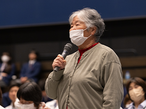 「総合的な学習の時間を使った、子どもたちの3年間の学びの集大成を見ることができ、本当に良かったです。発表のなかですごく心に響いたのが、『高齢者も障がい者も地域の財産』という言葉。また、中学生と高齢者や障がい者が交流することを『一緒に遊ぶ』と表現していて、なんと人間力が高く豊かな感受性を身につけているんだろうと感激しました。難しいテーマに中学生なりに取り組んでいて、感心します。似たような視点でも、まったく違った視点でも良いので、来年度以降も同様のプロジェクトを続けていき、活動を広げてほしいと願っています」